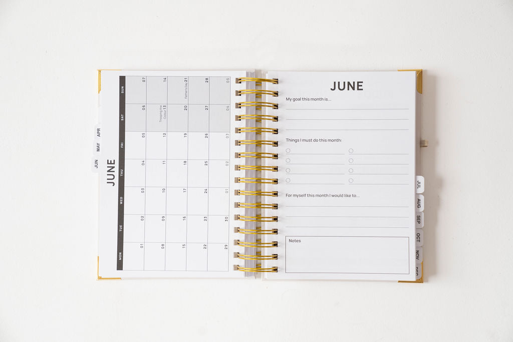 Monthly goal & task tracker a page each month to allow you to set your most important goal for the month ahead, set out a list of important tasks to tick off, and also a wellness section that allows you to note at least one thing a month that you would like to do for yourself. Helping you prioritise YOU!
