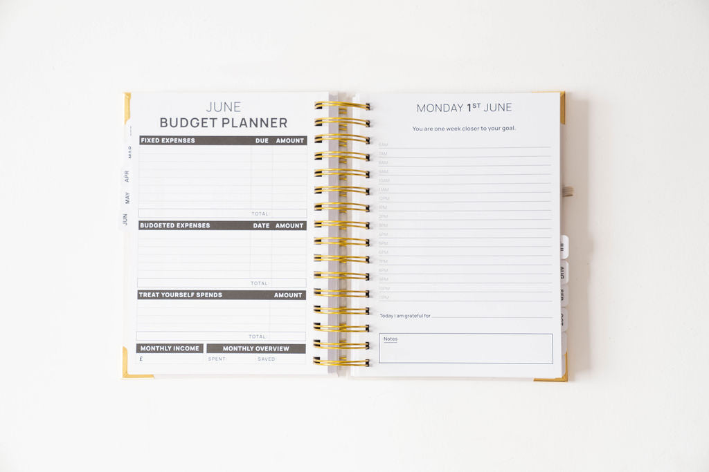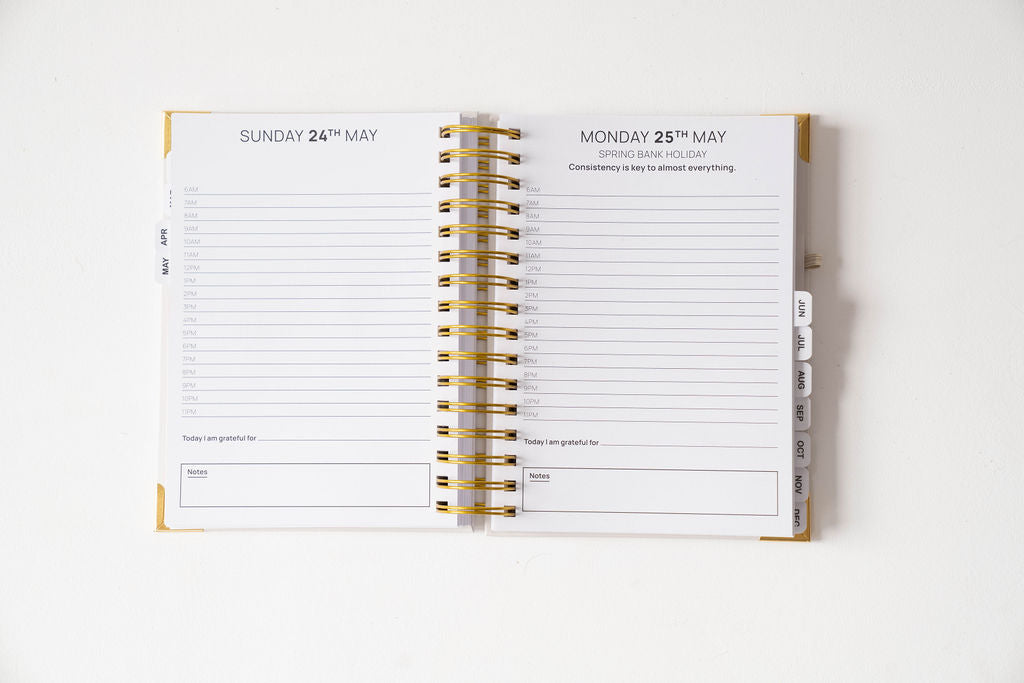 Our hardback planners are durable, hard-wearing and will accompany you in all your day-to-day activities. The glamorous gold spiral bind ensures ease of use as well as adding to the stylish, sleek appearance of the planner. Each planner has an inside cover pocket perfect to hold all those loose important documents such as receipts etc, that you wish to keep safe. There is also an elasticated pen holder to hold your pen in place whilst on the go.